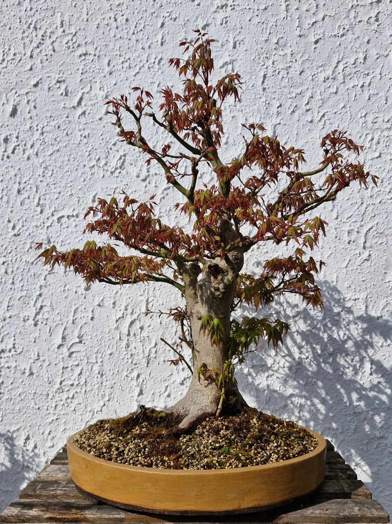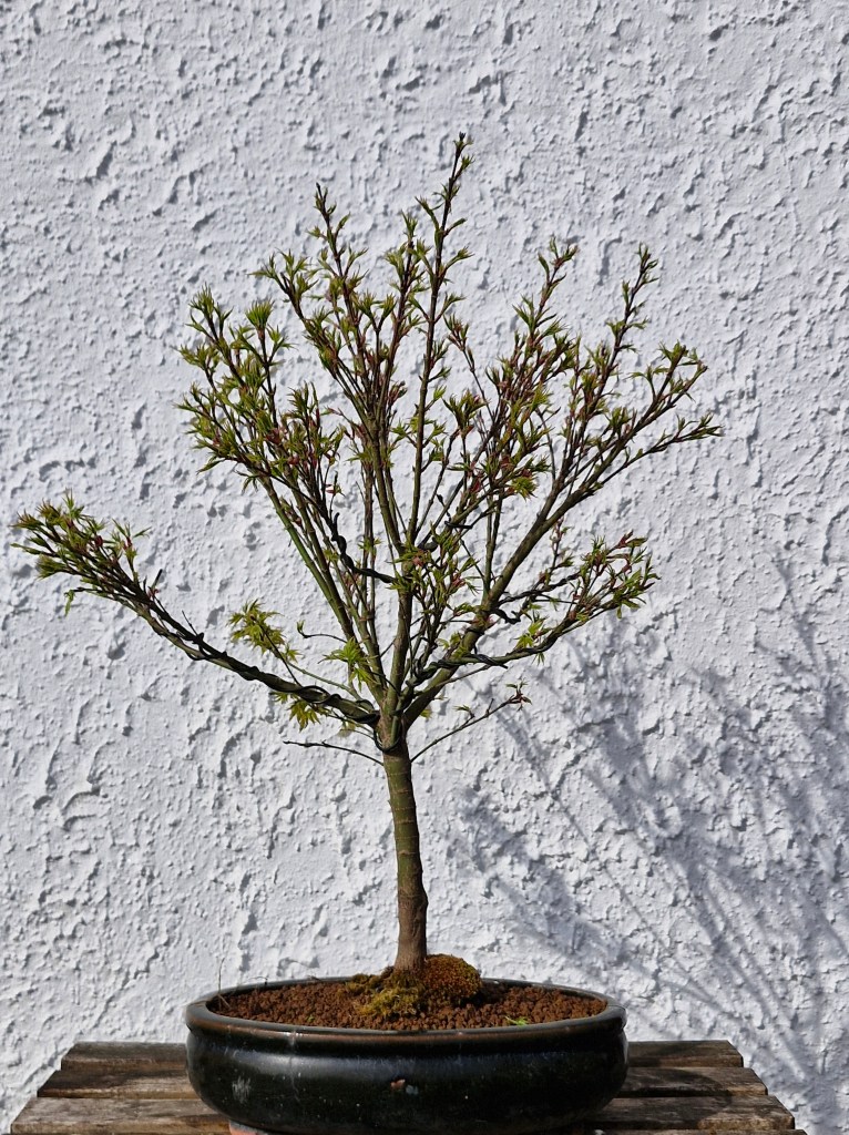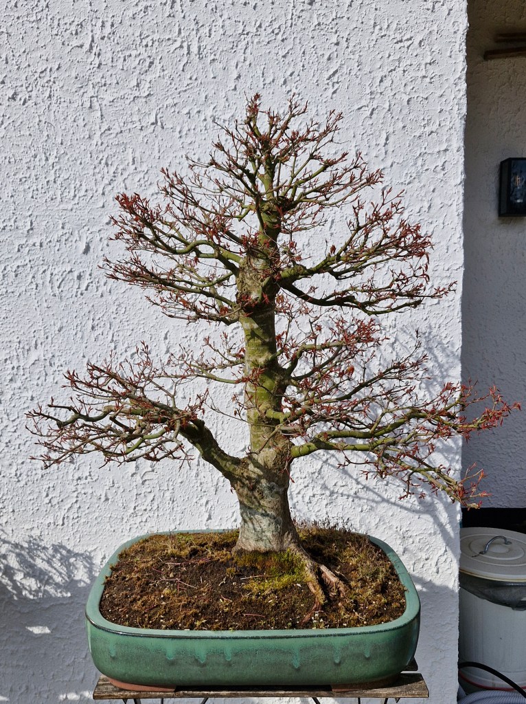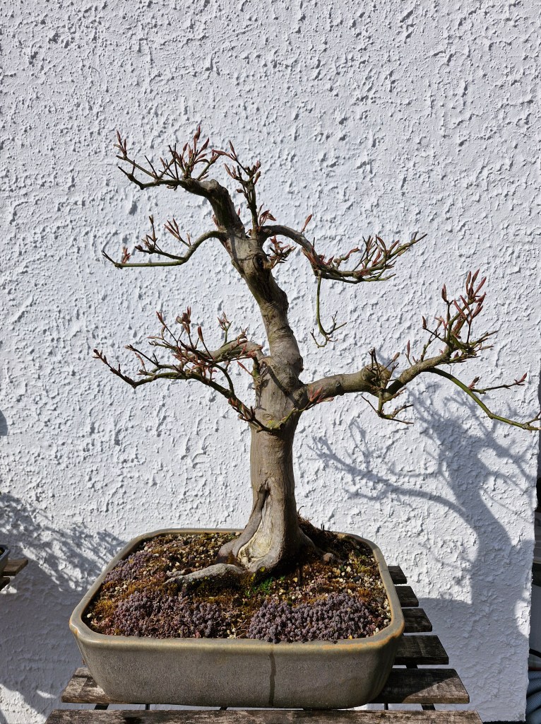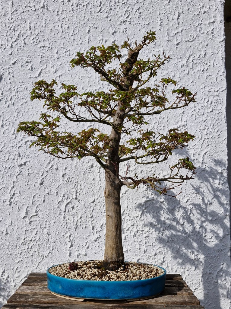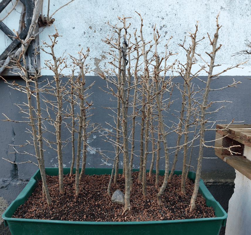 Nachdem ich eine Schale für die Gruppe gefunden hatte habe ich im Frühjahr 2022 die Bäume vom Container in die Schale gesetzt und sie um weitere Bäum ergänzt. Durch die dichtere Stellung und das Wegfallen der unnatürlich wirkenden Freifläche bei der Pflanzung wirkt die Gruppe deutlich besser. Jedoch blieb so immer noch das Problem, dass die Bäume aufgrund der Anordnung sowie des deutlich zu erkennenden ähnlichen Alters (gleiche Höhe, Durchmesser und Reife) immer noch das Bild eines Nutzwaldes erwecken.